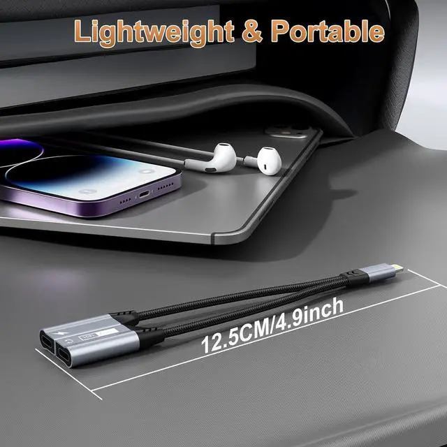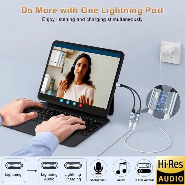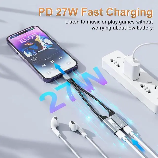 2-in-1 Multi-Function Lightning to Headphone Jack AdapterThe Lightning to Lightning adapter splits your Lightning port into a PD fast-charging port and LIghtning jack. This allows you to listen to music, make calls, play games, or watch videos while quickly charging your device. The iPhone splitter for charging and headphones offers high-resolution audio and 27W PD fast charging, so you don't have to worry about your phone's battery running low. Note: Data transfer is not supported.
