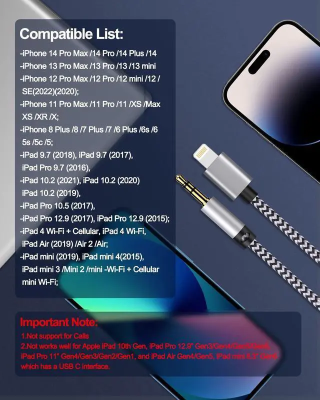 ![Alt view image 6 of 7 - iPhone Aux Cord, [2pack/3ft] Lightning to 3.5mm Audio Auxiliary Cable for iPhone 14 13 12 11 Pro Max Xs Xr 8 7 Plus, iPad mini, Male to Male Braided Apple Ox Wire for Car Stereo, Speaker, Headphone](https://c1.neweggimages.com/productimage/nb640/C6EHD2604230BAOSREB.jpg)