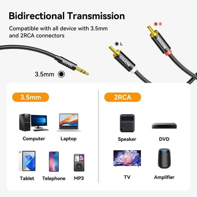 - SAMZHE 3.5mm Male to Dual RCA Stereo Audio Cable - TRS to L/R Channel Adapter for Hi-Fi Systems, Amplifiers, Audio Devices, Laptops, PCs.