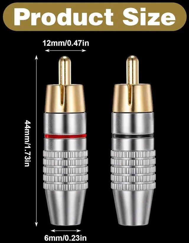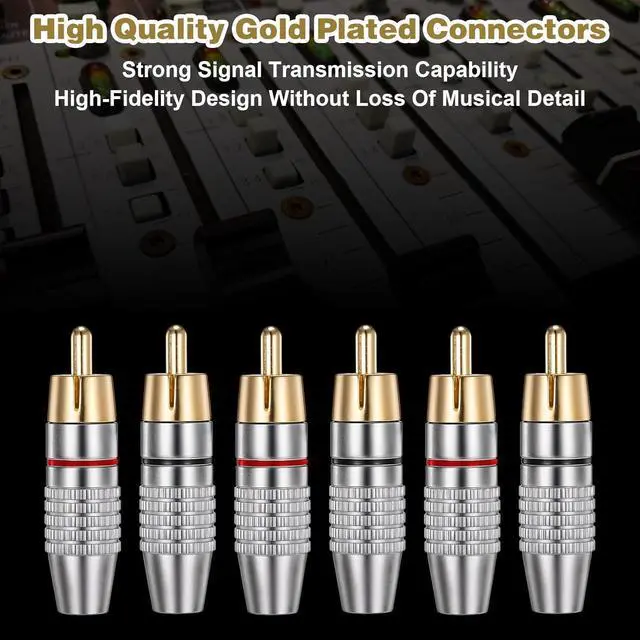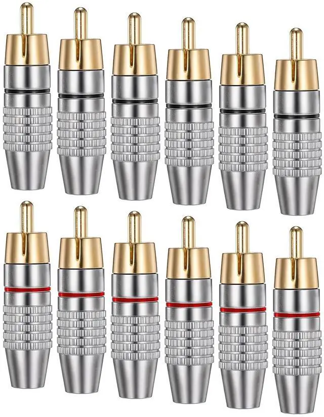 You Will GetSet includes 12 pcs gold audio video cable adapter connectors and is a reliable choice for permanent installations such as home theaters and CCTV surveillance systems. Solderless InstallationThese RCA male connectors feature a solderless design that simplifies the installation process for speaker wires and audio-video systemsQuality Signal QualityEngineered with gold-plated contacts and copper construction these RCA plug connectors maintain signal integrity and minimize transmission loss. Easy IdentificationThe RCA cable connectors' distinct coloring helps maintain proper channel separation for left and right audio signals reducing the risk of wiring errorsWide CompatibilityCompatible with cables up to 6mm in diameter these gold-plated RCA male plugs are versatile connectors for A/V receivers amplifiers mixers TVs DVD players CCTV cameras and microphones.