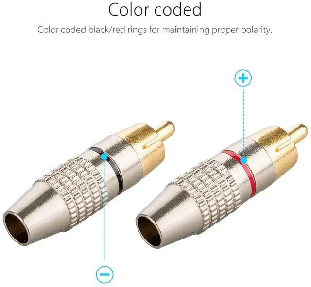 Corrosion-Resistant: Constructed with 24K gold-plated RCA connectors these plugs resist rust and ensure reliable signal transmission. Color-coded red and black rings make polarity identification simple when using RCA cable connectorsSecure and