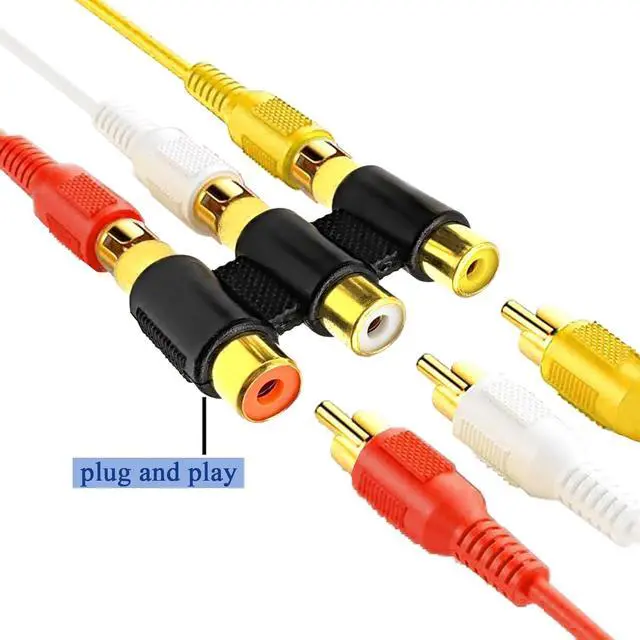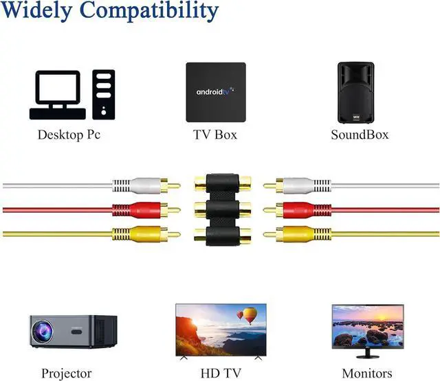 DVD players and moreHigh-fidelity transmission: Voluty Tek video adapter suitable for 3-RCA female to female triple tee adapter is made with gold plated materials ensuring stable signal transmission reducing signal loss and delivering clear audio and video qualityDurable construction: Gold-plated connectors resist oxidation extending the product's lifespan and ensuring long-term reliable performancePackage content: 2pcs of video adapter suitable for 3RCA female to female splitter connector Please let us know if there is any quality problemEasy to use: Voluty Tek audio video adapter no need additional setup required simply connect your devices for instant use. Easy and convenient operation making it user-friendly even for beginners