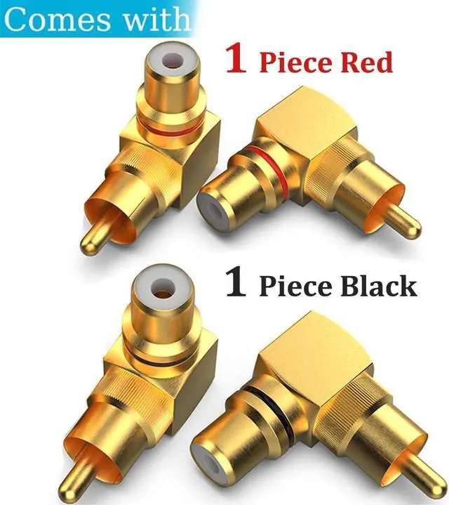 PACKAGE CONTENT: Cost-effective 8-Pack Gold-Plated 90 Degree Metal RCA Male to RCA Female Adapter (4 Red + 4 Black).
