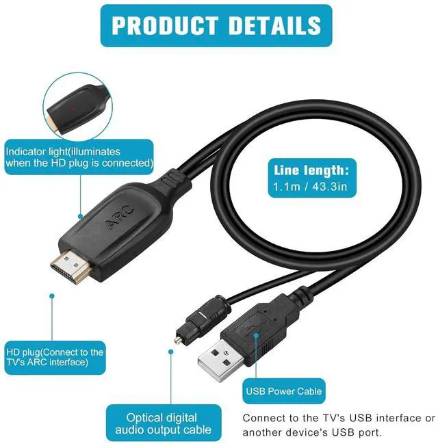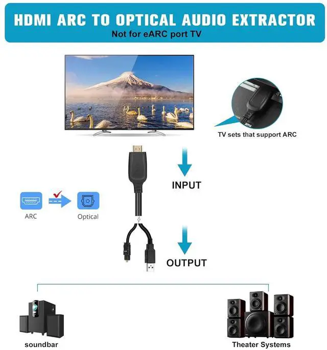 HDMI ARC to Optical Cable( 1.15 m/ 45.2 in: The ARC Audio Extractor connects to an ARC-compatible TV allowing the TV's audio to be transmitted to a sound system via the converter's built-in optical SPDIF digital audio cable. The ARC audio converter Only for TV with ARC interface Not for HDMI eARCor HDMI interfacePlug and