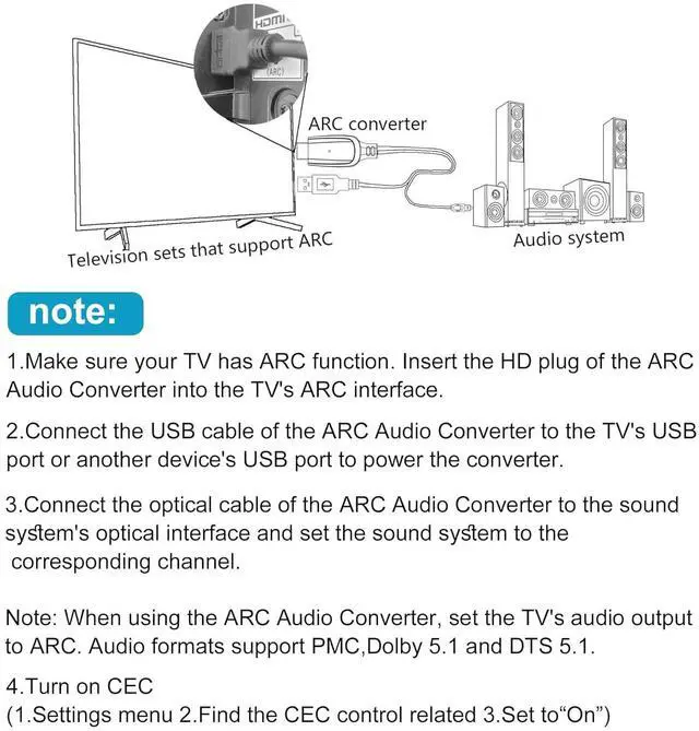 Audio or DTSNote: Connect the ARC Audio Converter's USB cable to your TV's USB port or another device's USB port. LED indicator will lights up when HD interface is connected. Using ARC Audio Adapter Setting up the TV(1. Turn on CEC 2. Set the TV's audio output to ARC 3. Set Audio Format to PCM LPCM Dolby or DTS 4. Refer to the TV's user manual for setup