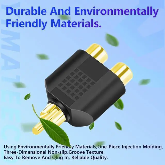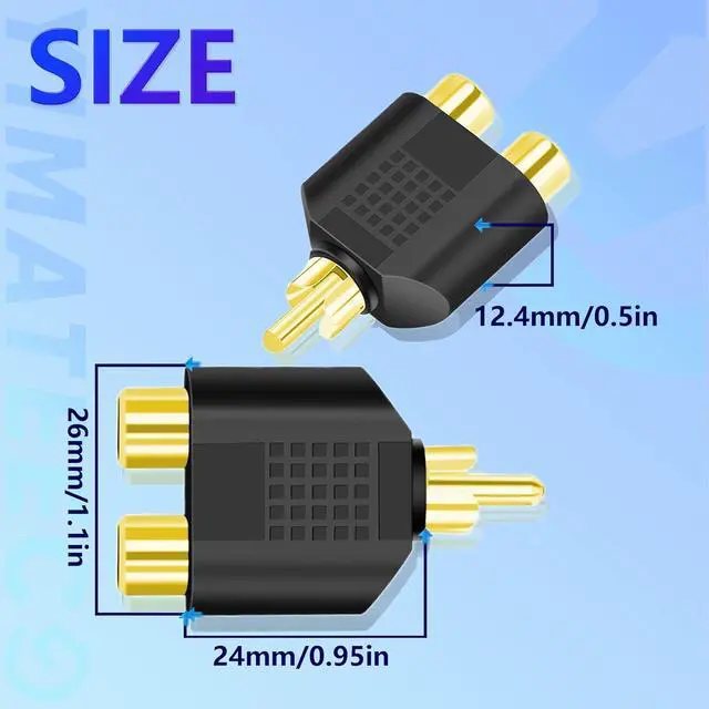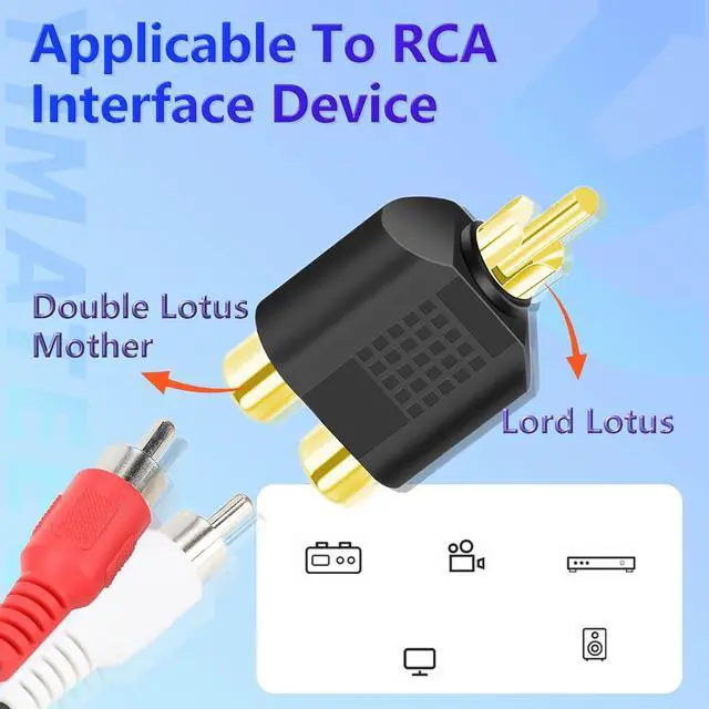 DELIVERY LISTYIMATEECO Provides: 10x RCA Splitter 1 Male to 2 Female Adapter 2x Silicone Ties (ice blue).? PRODUCT FUNCTIONYIMATEECO RCA Y Splitter provides you with the ability to connect RCA cables together to extend their length with stable and reliable transmission performance. 1 RCA male to 2 RCA female AV splitter adapter Plug. The AV splitter adapter connection is converted audio/video signal interface.? GOLD PLATED CONNECTORS24K gold plated rca connectors provide excellent corrosion resistance and are durable providing better sound quality and ensuring minimal signal loss.? PLUG & PLAYRCA splitter adapter has strong anti-interference plug and play and is easy to use.? WIDELY USEDRCA plug adapter 1 male to 2 female support for Stereo receivers or speakers VCR Blu-Ray VCD/DVD player AV receiver amplifier radio - subwoofer cable/satellite box HDTV TV and receiver or other RCA-enabled device.