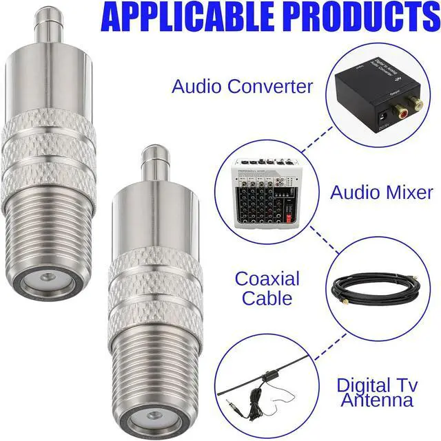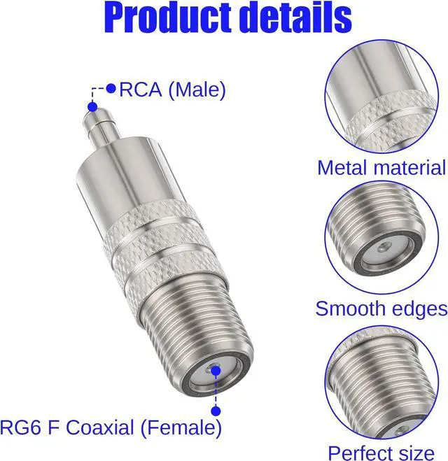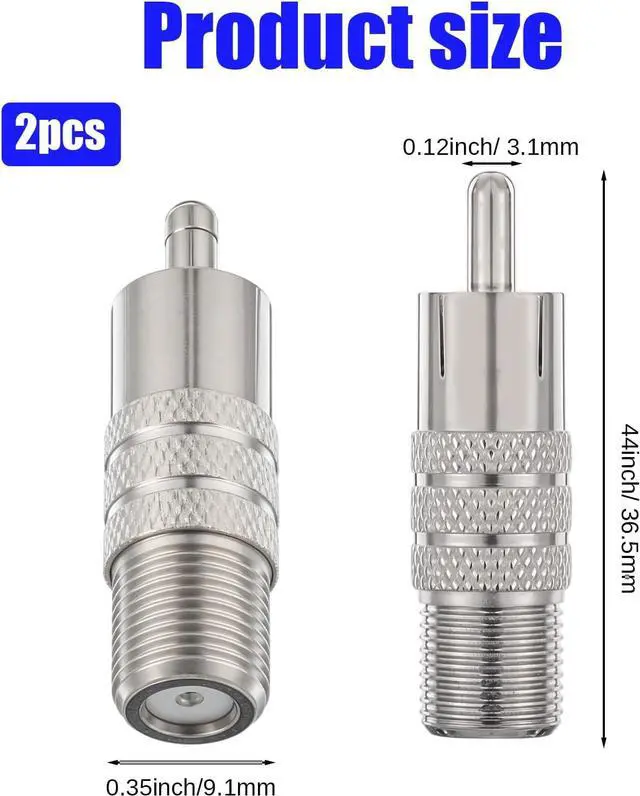 High-quality transmissionThis F-type female to RCA male adapter is crafted from durable zinc alloy ensuring low signal loss and excellent conductivity for superior audio and video performance in your devices. Durable structureMade from high-quality zinc alloy with a waterproof design this adapter is built to withstand various environments ensuring long-lasting performance and reliability. Easy to installThe male plug on one end and F female connector on the other allow for simple screw-on installation requiring no soldering or crimping making setup quick and hassle-free. Wide applicationPerfect for connecting coaxial cables to RCA male plugs this adapter is ideal for a variety of audio and video systems including TVs monitors DVD players home theaters subwoofers and gaming consoles.