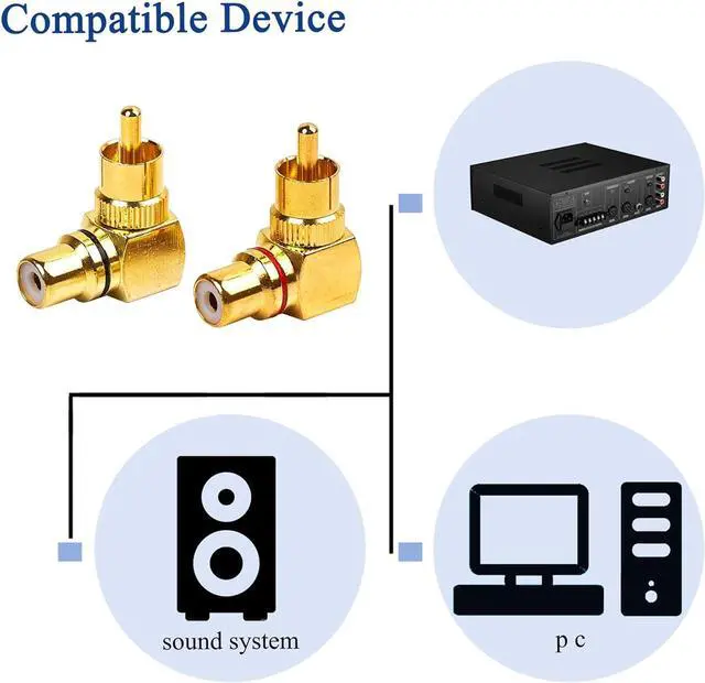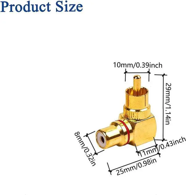 90 degree right angle design: Our video adapter suitable for RCA male to female right angle adapter features a compact elbow design saving space and preventing excessive cable bending making it ideal for tight spacesWide compatibility: Compatible with various audio and video devices such as home theater systems speakers gaming consoles DVD players and moreHigh fidelity transmission: Voluty Tek 90 degree plug adapter made with gold plated materials ensuring stable signal transmission reducing signal loss and delivering clear audio and video qualityDurable construction: Gold-plated connectors resist oxidation extending the product's lifespan and ensuring long-term reliable performancePackage content: 2pcs of video adapter suitable for RCA elbow cable adapter Please let us know if there is any quality problem
