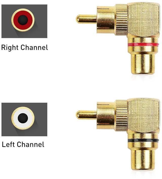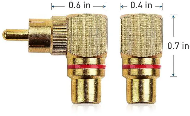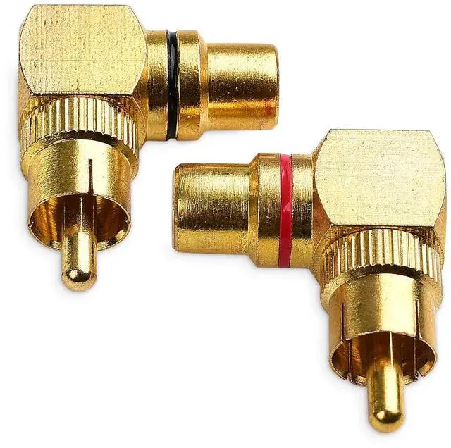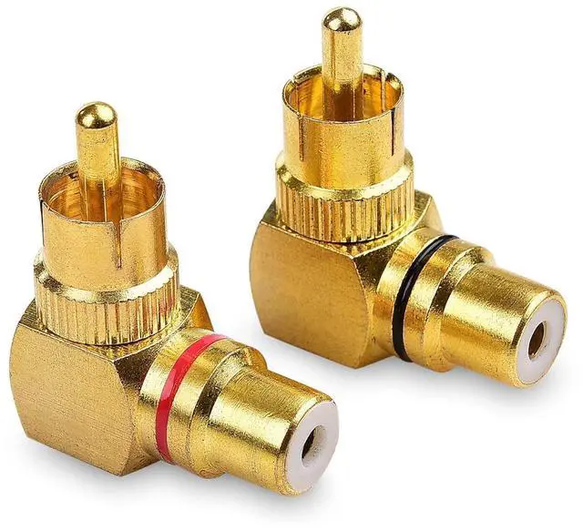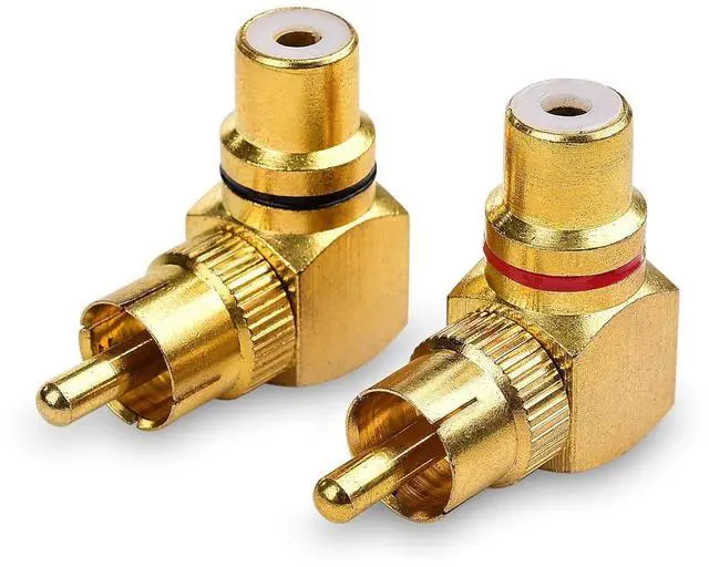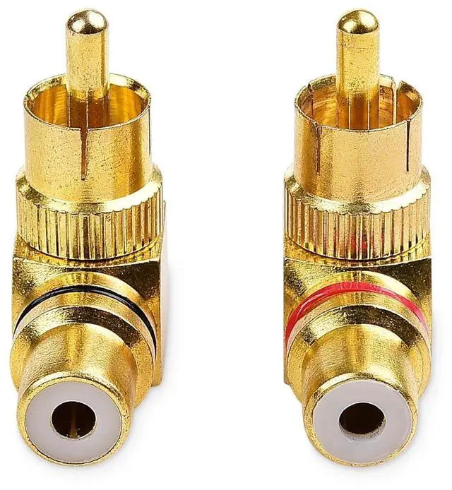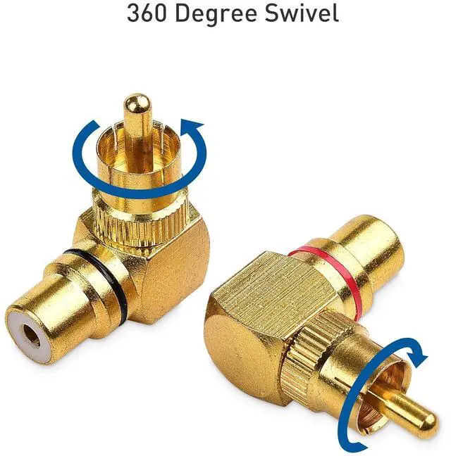 90 degree RCA adapter connects a subwoofer cable RCA audio cable or RCA component video cable to an A/V receiver subwoofer DVD player soundbar car stereo desktop computer or TVRight angle RCA adapter connects to the RCA white and red channel portsfound on video and audio electronic equipment; Adjustable RCA phono cable connector can be rotated to route the cable at the best possible angle from your AV receiverSuperior construction of Low profile RCA adapters include a solid metal housing with a gold-plated RCA plug; Extends less than 1 inch from the RCA port; 360 degree easy grip features on the right RCA plug make it easier to plug and unplugConvenient 2 pack provides right angle RCA adapters for the left and right audio channels; Plug in an RCA angle adapter to a subwoofer placed next to a wallAngled RCA elbow is compatible with cables and equipment with RCA connectors or RCA ports; Add a right angle to a flush wall box with RCA or RCA keystone jack instead of causing damage to the RCA cable from excessive bending; A lifetime warranty is included with these right angle RCA adapters for peace of mind when purchasing