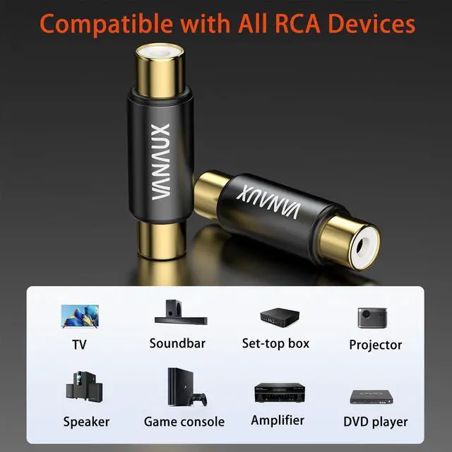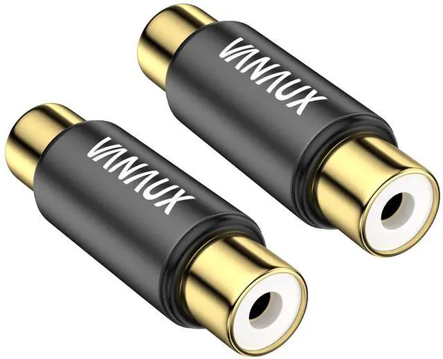 RCA female to female connector is made of 24K gold plated material sensitive contacts not easy to oxidise strong anti-interference stable transmission. RCA female to female connector is a good helper for any parts kit small and convenient easy to install tightly connect on both sides of the device can be to avoid excess wire hanging outside. RCA female to female connectors are used to extend RCA audio cables. Transmits audio and video signals between devices such as speakers camcorders DVDs VCDs amplifiers and televisions.