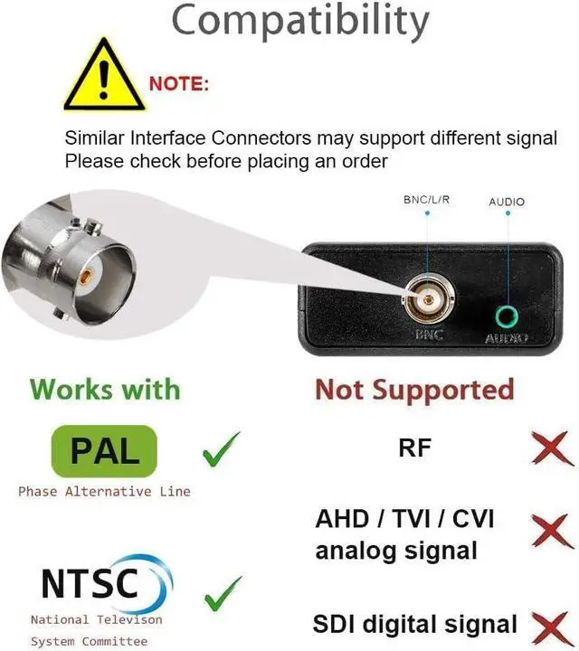 480i 576i standard definition support for two different video formats: NTSC/PALHDMI to BNC Adapter - Convert hdmi digital audio to 3.5 mm stereoL/Ranalog audio signal through the processing of DAC digital chip. Make HDMI video display on regular televisons and for VHS recording/video players as well as DVD recorders that can receive BNC signals. HDMI BNC Coax Connector - Compatible with HDCP signal and recognize HDCP Automatically.