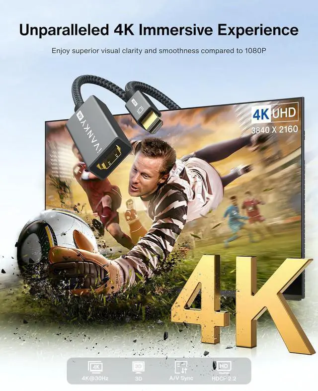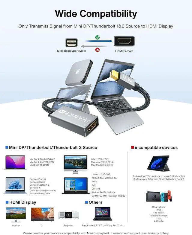 Note: NOT compatible with Thunderbolt 3/4/USB/Type-C[Superior Stability The Mini Display to HDMI Adapter (Not support hdmi to mini mini diplayport) delivers clear and smooth visuals at 4K@30Hz 1080P@120Hz along with flawless audio pass-through for uncompressed digital 7.1 5.1 or 2 channels. Experience lightweight and portable connectivity with the Mini DisplayPort Male to Female adapter. To ensure enhanced video and audio quality pair it with an iVANKY HDMI Cable; please note that an extra HDMI cable is necessary[Incredible Durability] Noticeable difference in build quality of the Thunderbolt-to-HDMI adapter; Slim shell size frees you from the worry of getting in the way of nearby ports; Nylon braided jacket withstands over 15 000 bends not easily broken anymore; Multiple shielding 24K gold-plated connectors provide reliable interference-free data transmission and improve transmission stability[Fine Compatibility] Ideal for MacBook Air (BEFORE 2018) MacBook Pro (BEFORE 2016) iMac (BEFORE 2017) Surface Pro Lineup Surface Laptop Surface Book (NOT Surface Book 2) and any other laptops with a Mini DisplayPort Output (? NOT New MacBook with Type-C port)[iVANKY's Customer Support] You'll receive 1 pack 4K Mini DP to HDMI adapter along with our friendly support team ready to help within 24 hours; Each iVANKY cable undergoes meticulous testing to ensure it meets the highest quality standards; We also provide expert technical support to all our customers; Additionally you can enjoy conditional customer support for up to 54 months