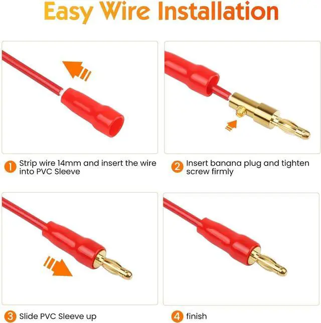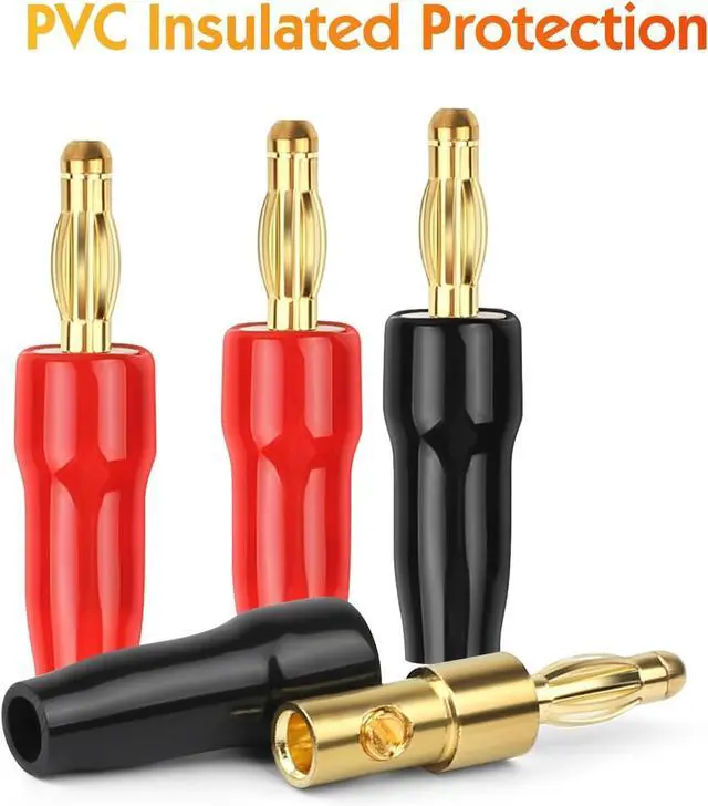 Speaker Pin Connectors with Pin Screw Type Speaker Wire Plugs provide optimum signal transfer from speaker wires. 4 mm Pin screws keep the speaker wire connection strong and secure. Speaker Wire Plug Connectors make speaker wire installation easy and is best suited for Spring Clips Speaker Wire Terminals Speaker Wire Wall Plate Home Theater Audio/Video Receiver Amplifiers and Sound SystemGold plated speaker plug connector pins resist corrosion for long lasting use and insulated banana plugs to avoid shorting or short circuiting. Positive end for red and black end for negative speaker wire connector. Speaker plug accepts speaker cable sizes from 12 AWG 14 AWG 16 AWG 18 AWG 20 AWG speaker wire.