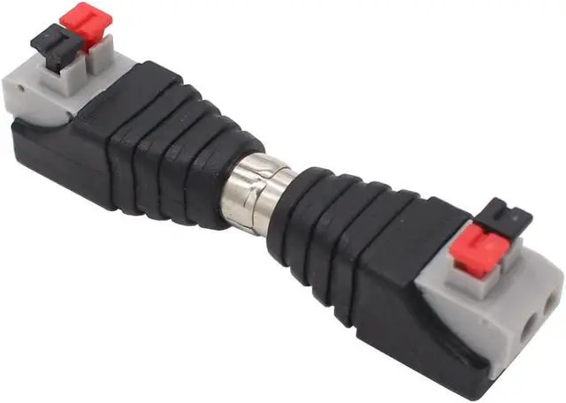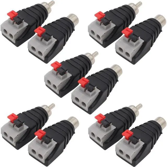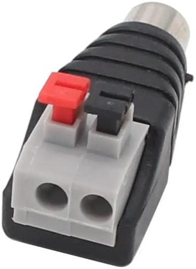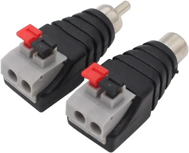 Press style Speaker Wire Cable to Audio Male and Female RCA Connector Simply & professional appearance for power cabling. This RCA Plug Male Female Connector is very easy to install. No soldering and screw required. Press the button insert a stranded or solid core wire release the button and done your wiring job. RCA jacks to speaker wire is professional for CCTV installers and excellent for all DC cameras Part. Fit Max 14awg wire.