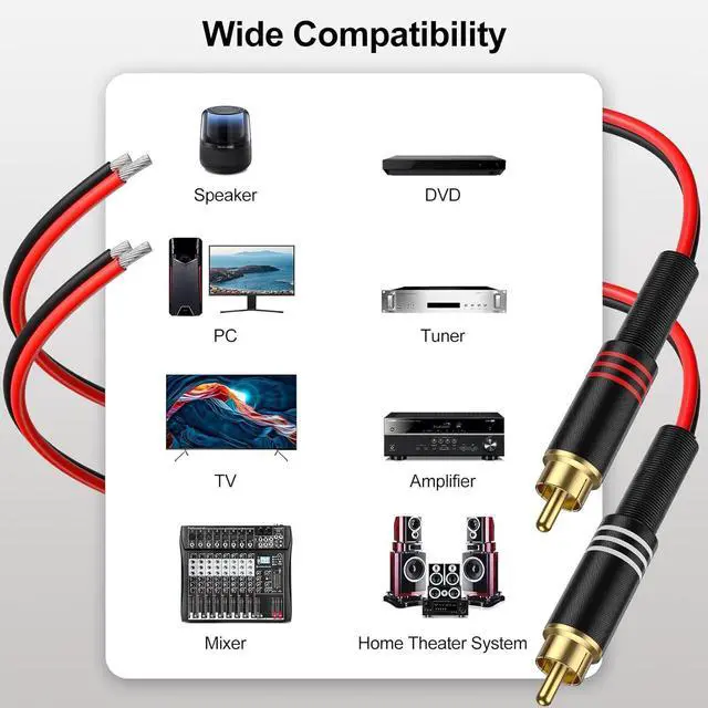 Compatibility: mainly used to repair worn or damaged RCA to bare wire speaker cable for subwoofer DVD players HDTVs speakers stereo receivers audio and video AV receivers amplifiers tuners home theater systems hi-fi systems and other devicesWhat