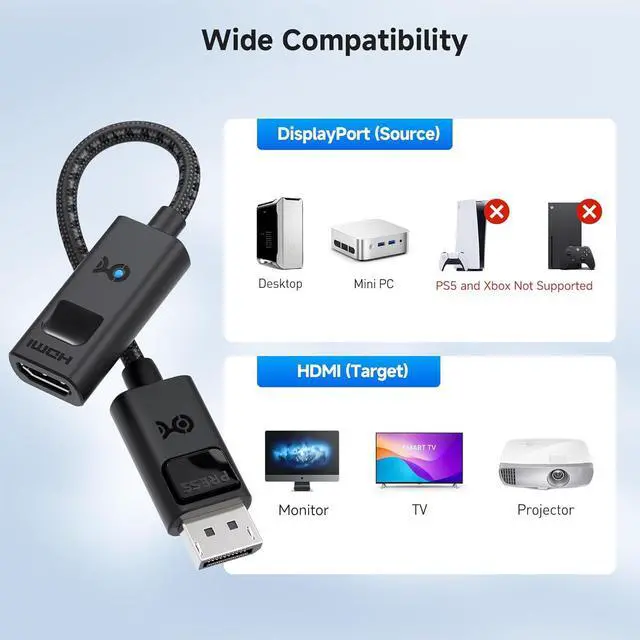 Note: Only works from DP (PC) to HDMI (display). Not compatible with PS5 or Xbox.