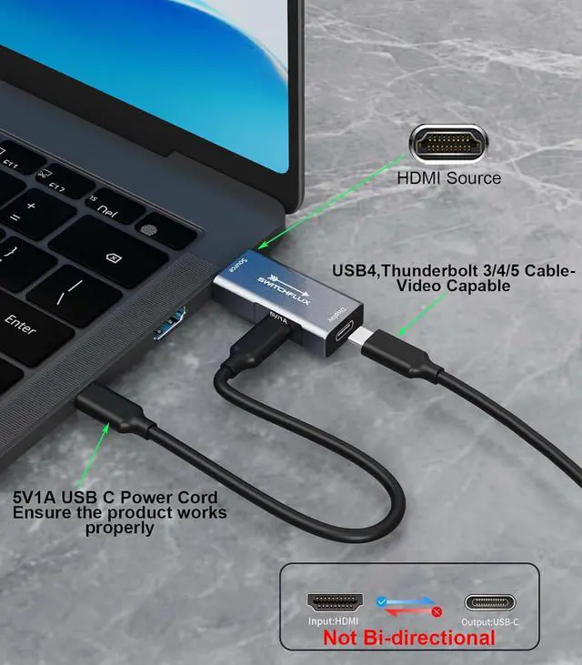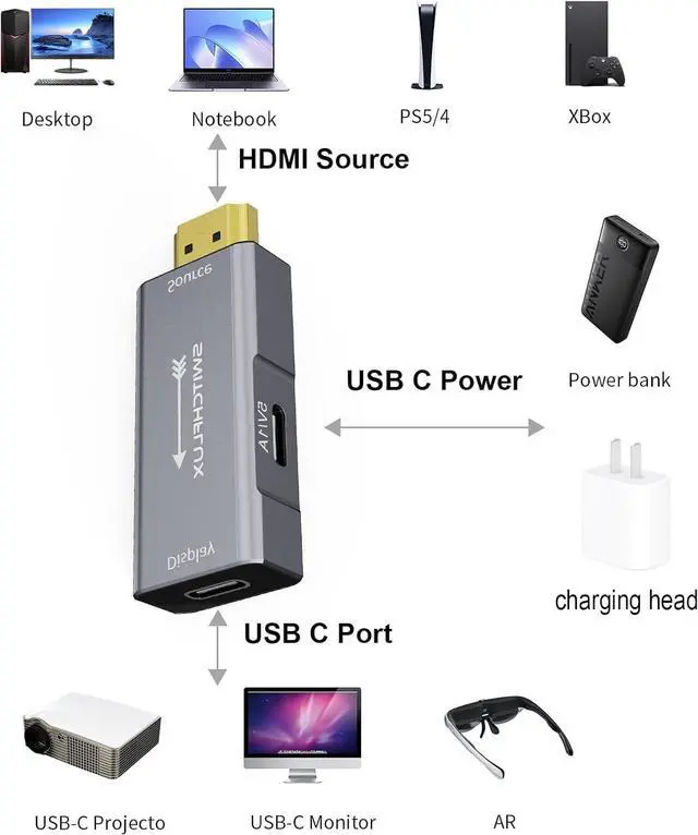 Uni-directional HDMI to USB-C AdapterSWITCHFLUX HDMI to USB-C adapter is a uni-directional device designed to transfer signals from an HDMI source (e. g. laptops PS5 Xbox TV boxes) to a USB-C display (e. g. XREAL Ar Nreal Ar AR glasses or USB-C monitors). Simply plug the HDMI male connector into your HDMI source device and connect the USB-C female port to your display using a USB4/Thunderbolt 3/4/5 cable.