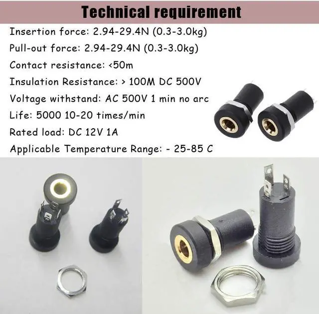 Connector Body Material: Plastic. Connector Mounting: Chassis. Contact Plating: Gold over Nickel. Contact Termination: Solder. Rated load: DC 12V 1A Size: as the picture show.