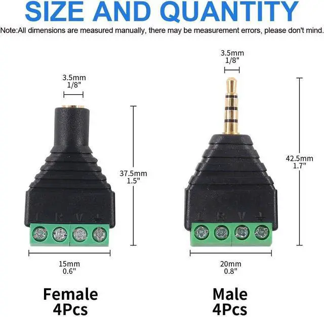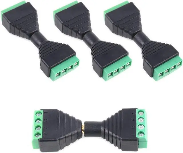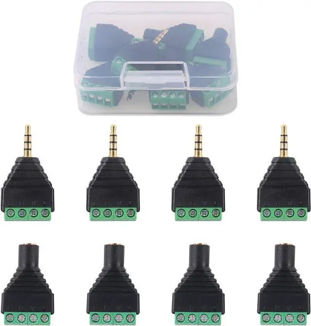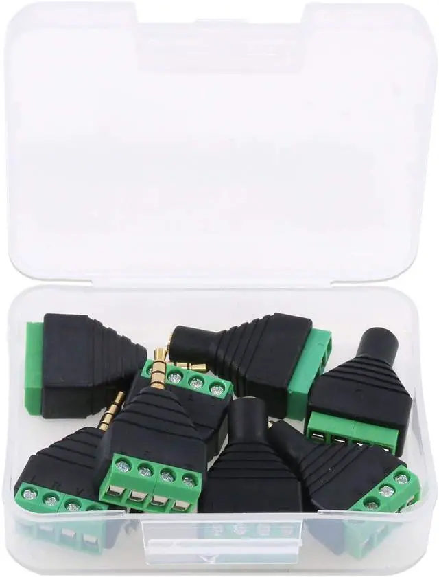 Application: These male and female terminal-block audio connectors are matched well mainly used for microphone plug earphone plug can also be used for CCTV camera applications black molded plastic construction.
