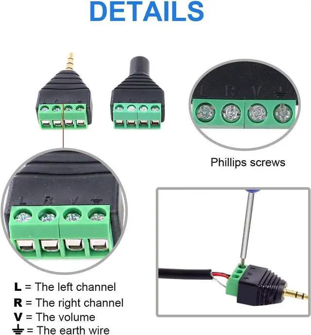 Feature: They are screw/solderless type it is more convenient to use more quickly without welding. You can just use stranded or solid core wire and a small screw driver to create custom wiring jigs.