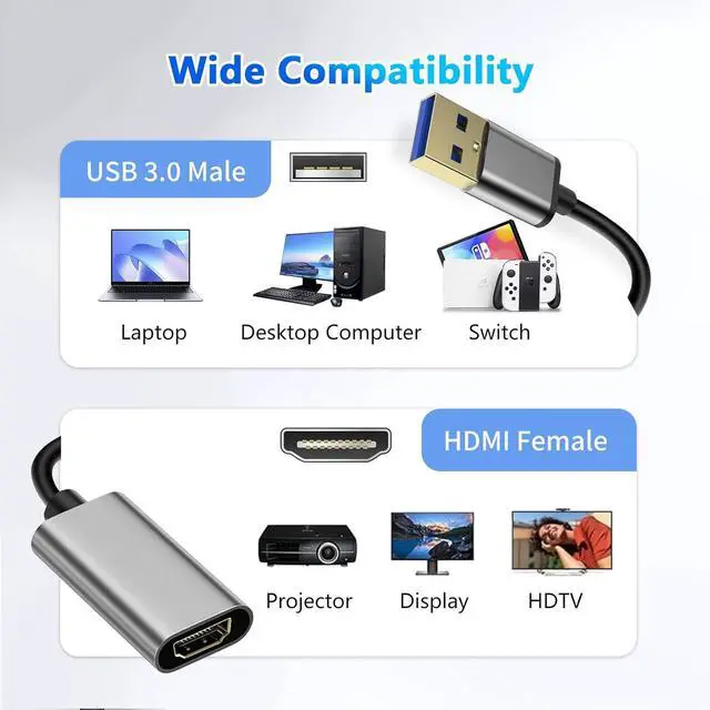 USB 3.0 to HD Adapter- Our usb a to hd allows seamless connections and clearly display between a computer with USB interface and a modern HD HDTV monitor or projector. please feel free to enjoy a high-definition audio and video at the same time. Please noteNOT work for ChromeOS Linux and any other operating system devices! Need to install drivers for use. Wide Compatibility- This USB 3.0 to HD adapter is compatible with multiple operating systems such as Windows 11/10/8/ 8.1 /7 and MacOS which much more helpful than others who only supports up to Windows 10.