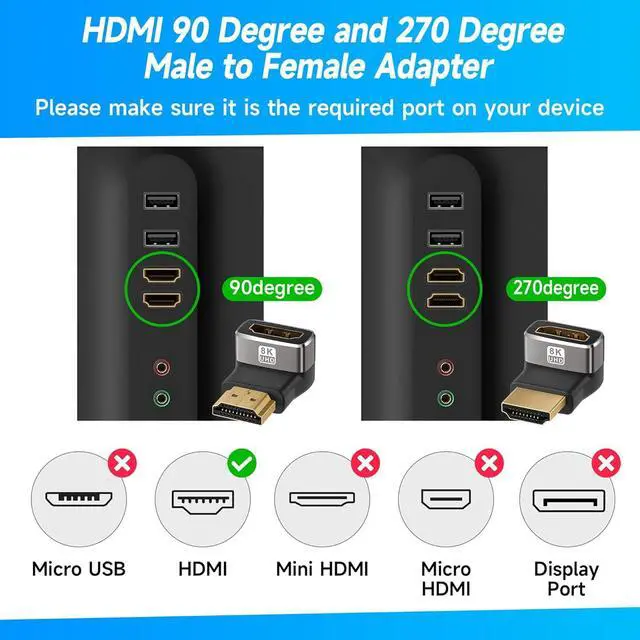 Right Angle Design: 90 degree and 270 degree HDMI adapter can be selected to change the interface direction to avoid bending HDMI cables and relief the strain on HDMI ports. Our HDMI connector fits for wall-mounted devices solving the embarrassment of limited spaces between wall and device. (At the same time it can protect female devices such as monitors computers and laptops to prolong the service life.