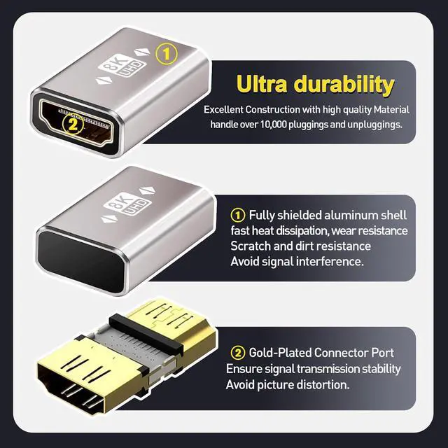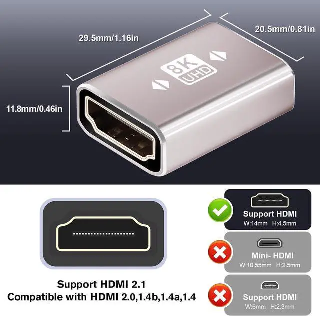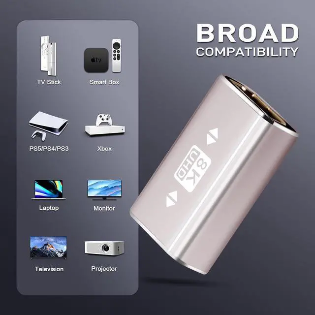 8K HDMI Extender connect two HDMI Cables for long distance transmision. Support 8K@60Hz / 4K@120Hz 7680x4320@60Hz 2K@240Hz 1080P@240Hz. DT Dolby sound and HDRGold-Plated Contacts ensure stable signal transmission; Fully shielded aluminum shell can avoid signal interference and wear resistanceThe HDMI Coupler can handle over 10 000 pluggings and unpluggings. The HDMI to HDMI adapter is suitable for all devices with HDMI Male head such as TV Box PC Laptop HDTV Monitor Projector and so onPackage