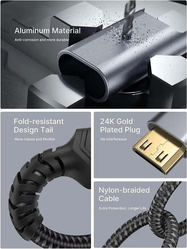 HDMI portExtremely Durability: 32AWG copper wire with triple tin shielding reduces the probability of interference with wireless services such as Wi-Fi; High quality nylon braid tested to be plugged and unplugged 5 000 times; Gold-plated corrosion resistant connectors for guaranteed top tier image and soundCompact and