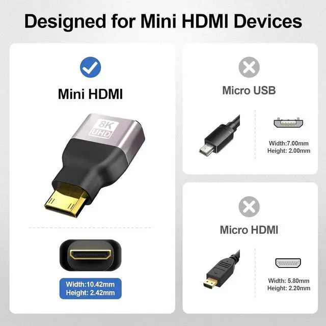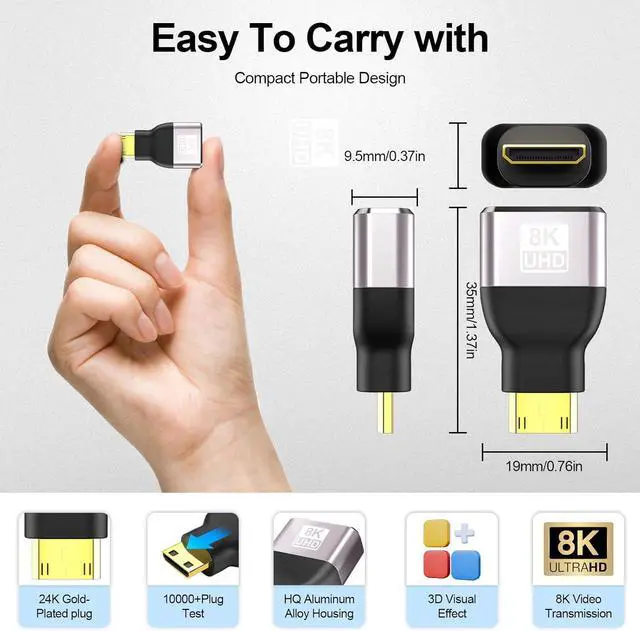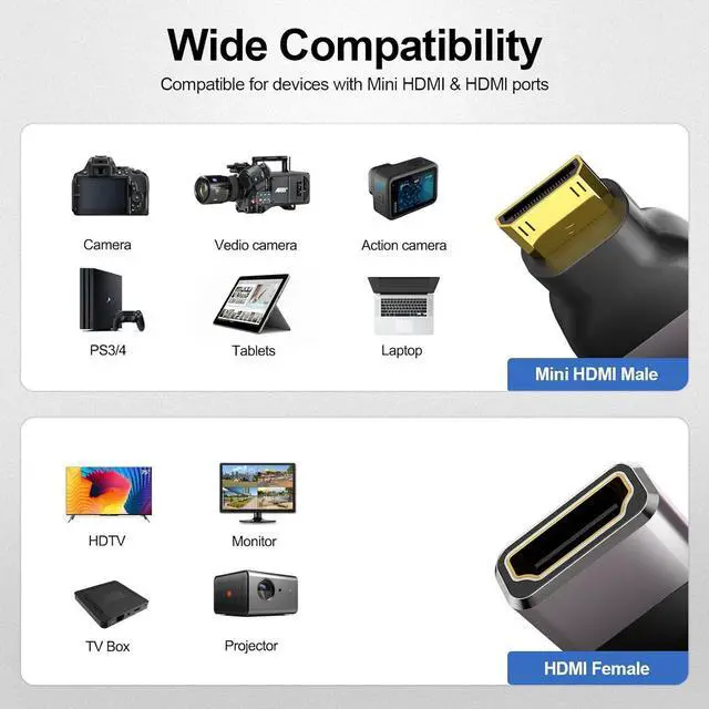 Note: Designed for Mini HDMI ports only (not Micro HDMI/USB). Perfect for laptops (ThinkPad Yoga 12) Raspberry Pi Zero NVIDIA Shield DSLRs and 8K-capable GPUs like GeForce GT 430. Gold-Plated & Durable Corrosion-resistant gold-plated connectors ensure stable signal transmission while the compact sturdy design guarantees long-term reliability. Convenient 2-Pack Includes two Mini HDMI to HDMI adapters perfect for home office or travel. Keep one as a backup or share with family! Worry-Free Warranty Backed by a 36-month warranty and 24/7 customer support. Contact us anytime for assistance! Widely CompatibleCompatible with DSLR Camera/Camcorder/Graphics Video Card/Raspberry Pi Zero/Pi Zero W/Laptop/Tablet/HDTV/Pico Projector/NUC barebones desktop/Sony HDR-XR500/Nikon D3200/Nikon D810 and more devices with mini HDMI port