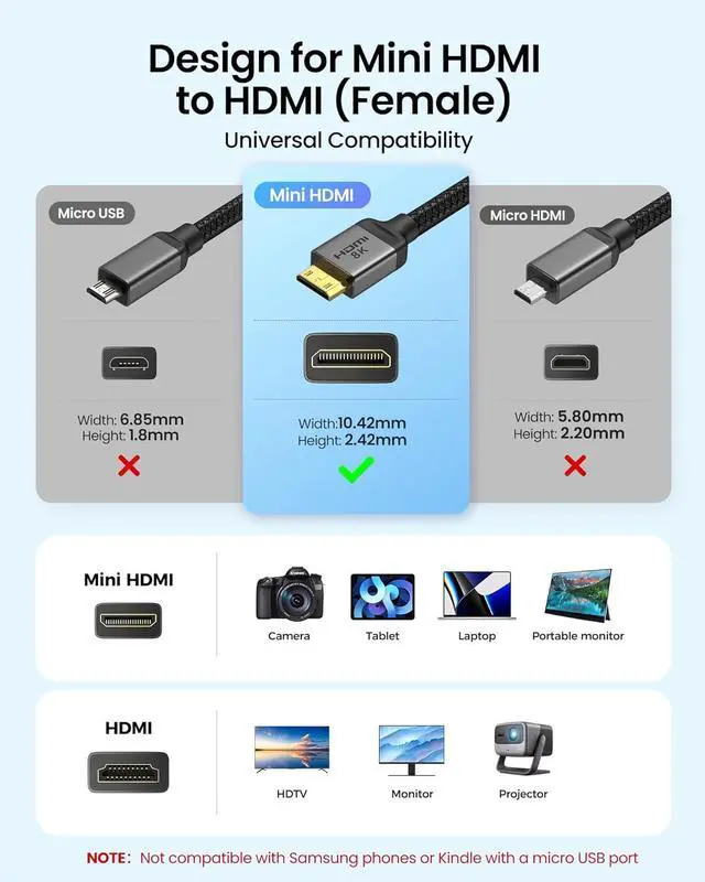 NOTE: Please make sure your device has mini HDMI port. Enduring and PortableThis HDMI Mini adapter features double-layer fishnet and nylon braiding for enhanced strength. Multiple shielding layers ensure stable signal transmission. Gold-plated connectors and aluminum alloy housing offer 3x durability and 50% better anti-interference. Supports bidirectional transmission plug-and-play and a compact connection. Lightweight and space-saving its good for travel and home office use. Universal CompatibilityCompatible with Cameres Camcorders Tablets Laptops HDTVs Raspberry Pi Zero Projectors(NOTE: It can not fit for phone or tablet with micro USB). Services from SilklandWe take pride in delivering top-quality cables and exceptional customer service. We are committed to supporting you throughout the purchasing process of this mini HDMI to HDMI female adapter. We offer a 24-month after-sales service and technical support available within 18 hours to resolve any issues you may encounter.