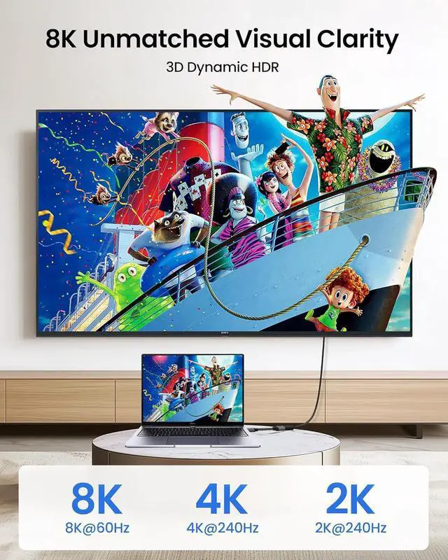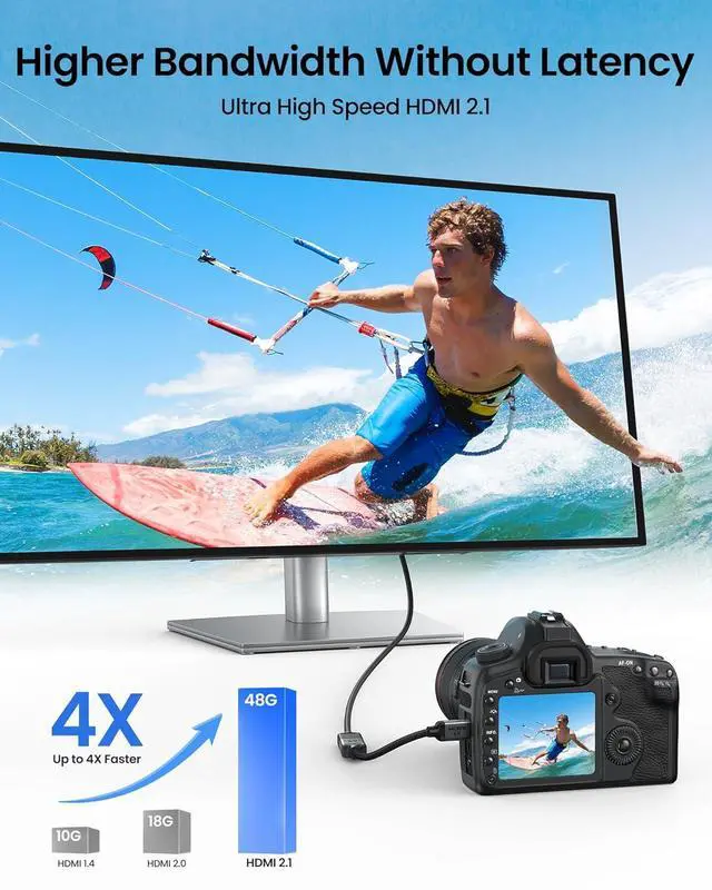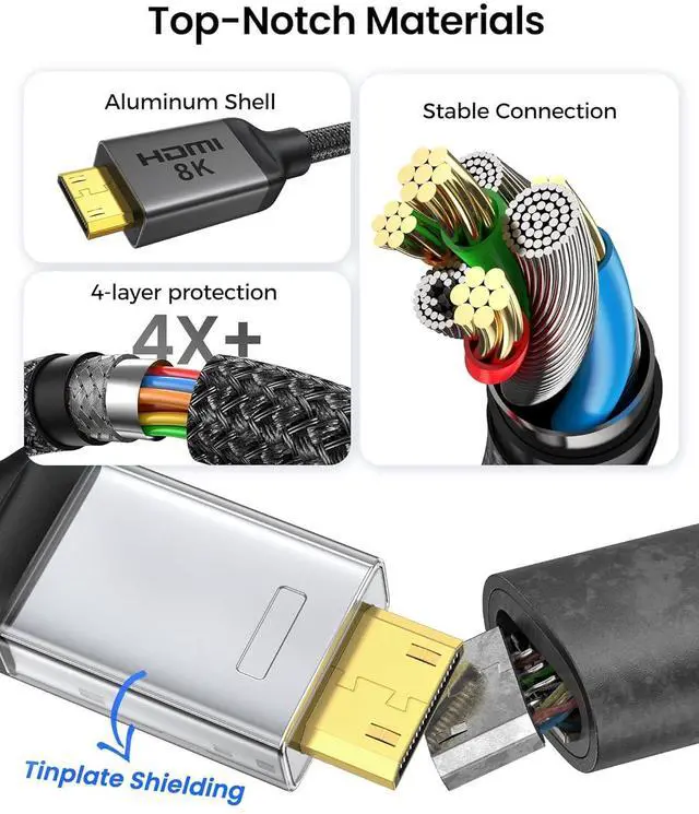 48Gbps BandwidthThis Mini HDMI to HDMI adapter supports the latest HDMI 2.1 standard with blazing-fast 48Gbps bandwidth. Whether you're playing HD videos or enjoying live broadcasts experience ultra-smooth seamless performance and crystal-clear visuals. Support 8K HD Video8K 2.1 Mini HDMI Male to HDMI Female connector support full 8K resolutions 7680x4320@60Hz 4K@240Hz 144Hz 120Hz 2K@240Hz. It also backs Dynamic HDR/3D eARC Dolby Atmos. With Dolby Atmos you can now enjoy cinematic sound quality in your living room for an immersive multi-dimensional experience.