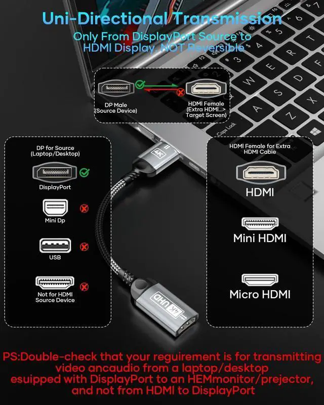 Unidirectional DisplayPort to HDMI AdapterBuilt-in advanced IC chip converts DisplayPort signal to HDMI signal; it is not a bidirectional converter and cannot transmit signals from HDMI source to DisplayPort monitor so it is not suitable for HDMI source devices. 4K UHD Visual FeastWith this DisplayPort to HDMI adapter you can stream 4K@30Hz/2K@60Hz/1080P@120Hz videos directly to your HDTV monitor or projector and enjoy realistic 3D video effects with clear high-quality sound. Smooth video and audio streaming immerses you in a true cinema experience. Supports DisplayPort 1.2 HDCP 1.4 HDMI 1.4 and HDR providing you with clear images.