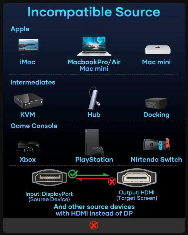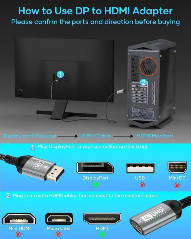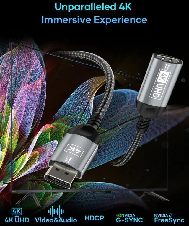 Note: Does not support MacBook and macOS hubs docking stations PS5 Xbox Nintendo Switch or LG C2 LED series TVs. Stable Signal and Durable DesignThe slim and lightweight aluminum housing is corrosion-resistant and ensures optimal heat dissipation. In addition the cable has a braided jacket to ensure flexibility. With 32AWG tinned copper conductors this extension cable guarantees conductivity and elasticity. The aluminum foil and Al/Mg braid shielding minimizes EMI and ensures stable signal transmission. What You GetYou will receive 1 pack of DP to HDMI adapters along with our friendly support team ready to help within 24 hours; Every Nersligek cable is carefully tested to ensure it meets the highest quality standards; We also offer expert technical support for all our customers; In addition you can enjoy conditional customer support for up to 12 months.