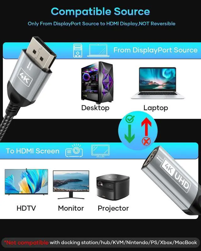 Wide CompatibilityThis 4K DisplayPort to HDMI adapter is compatible with a wide range of laptops desktops GPUs and other devices with DisplayPort. Connects to TVs projectors monitors and HDMI displays for DisplayPort source devices only.