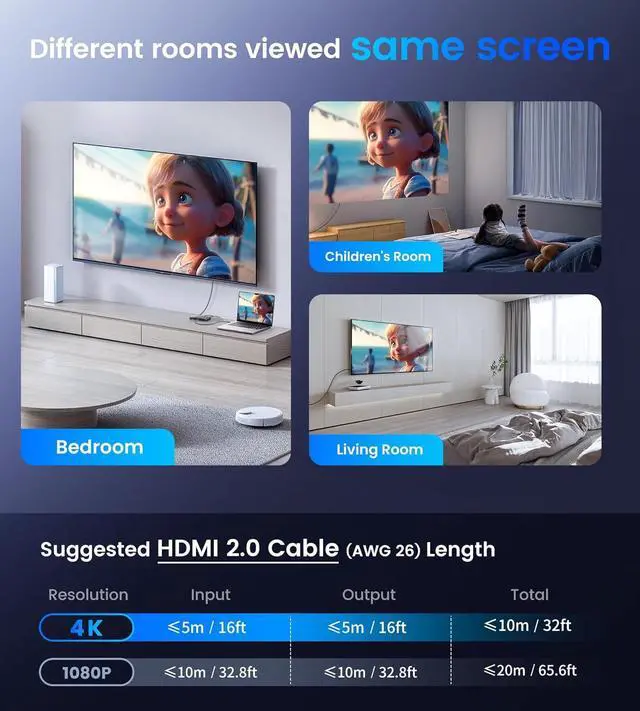 HD Resolution: Support high resolutions including 3D 4K x 2K@30hz 1080P @30hz 1080P@60hz support 8/10/12bit deep color. It could provide 10.2 Gbps bandwidth for wide-ranging use. With the AWG26 HDMI standard cable the distance between input and output could reach up to 32ft/16ft (1080P resolution: Input 32ft