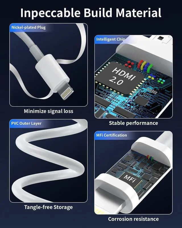 Digital AV Adapter: The iPhone to hdmi adapter offers unique features that set it apart from the competition. Our Lightning to HDMI Adapter is equipped with an MFi certified chip ensuring stable video output. Enjoy content stress-free on a large screen without experiencing delays. Whether you're presenting gaming or streaming videos our ipad to hdmi cable adapter delivers reliable and lag-free performance you can enjoy crystal-clear audio and high-definition video with easeHassle-Free Lightning to