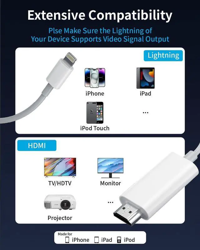 Compatibility: This iphone hdmi adapter cable compatible with iPhone 14 / 14 Pro / 14 Pro Max / 14 Plus / SE 2022 / 13 / 13 Pro / 13 Pro Max / 13 Mini / 12 / 12 Mini / SE 2020 / 12 Pro / 12 Pro Max/ 11/ 11 Pro/ 11 Pro Max/ XS/ XS Max/ XR/ X/ 8/ 8 Plus/ 7/ 7 Plus/ 6S/ 6S Plus/ 6/ 6 Plus/ 5/ 5S/ 5C/ SE iPad Pro iPad Air iPad Mini iPod Nano7 iPod Touch 5th/ 6th Gen/ 7th Gen. The hdmi to iphone supports iOS 8.0 or aboveApps
