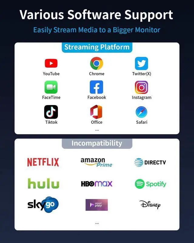 Supported: This Lightning to HDMI cable supports video calls from FaceTime Skype WhatsApp; and supports streaming videos pictures games lideshows on Tiktok ABC NBC FOX IDMB Twitter (X) Reddit YouTube Quickflix Facebook Instagram Pinterest Snapchat Family On TV Office IE browser Chrome browser etc. Please note that the HDMI to Lightning adapter does not support Netflix Prime Videos Hulu Comcast TV HBO go Honda Motor Xfinity Vudu DIRECTV etc
