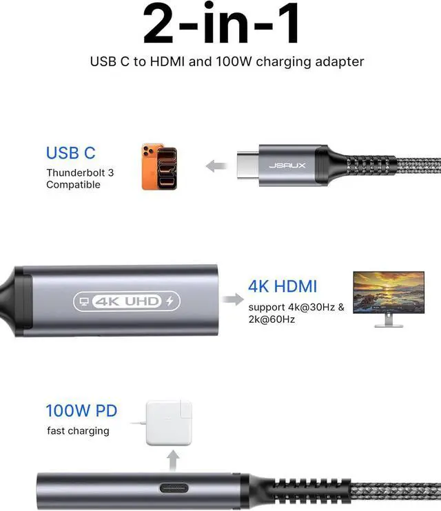 Never Worry about the Power HDMI 4K Video out and USB C 100 charging 2 ports work at the same time. So you can play continuously as you want and never worry about the electricity. Convenient for home-theater entertainment office presentation exhibition teaching etc4K UHD HDMI Port Supports max 4K@30Hz 3840x2160 (backward supports 2K 1440P 1080P) provides life like and fluent frames to your large display screen giving you a realistic 3D screen experience. offering vivid clear no shaking video and picture100W Type C Charging With 100W Charging port your devices will keep a higher electricity and you can keep far from away powerless anxiety.