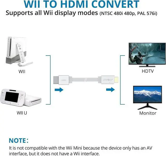NOTEPlease set your HDTV to the corresponding HDMI input to avoid a black screen or malfunction. It is NOT COMPATIBLE with the WII MINI because the device only has an AV interface but it does not have a Wii interface. Some devices' auto-setting of screen resolution is 480i instead of 480p which may not support games at 240p/480i over HDMI. If you switch to 480p mode they may work over HDMI. it can't be connected to the switch/splitter only connect directly to the TV monitor projectorHD Output CompatibilityThis Wii to HDMI converter supports 1080P full HD output allowing you to connect your Wii console to any HDMI-compatible device such as HDTVs monitors and projectors providing clear lossless video and audio qualityFull Support for All Wii Display ModesThe converter supports all Wii display modes including NTSC 480i 480p and PAL 576i.