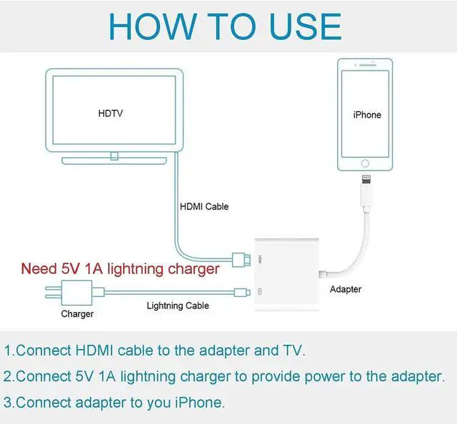What You Get: a Lightning to HDMI Adapter for iPhone to TV Perfect way for viewing your iPhone/iPad through the TV with this affordable and high-quality adapter. We also provide an 72-month warranty and friendly customer service. Any Problems Please Feel Free to Contact us.