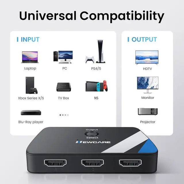 HDMI SWITCH]: 3 HDMI ports in and 1 HDMI out for various HDMI devices HDMI switcher 3 ports can work with most devices with standard HDMI interface. HDMI switcher 3 In 1 out (Does not support 1 in 3 out)