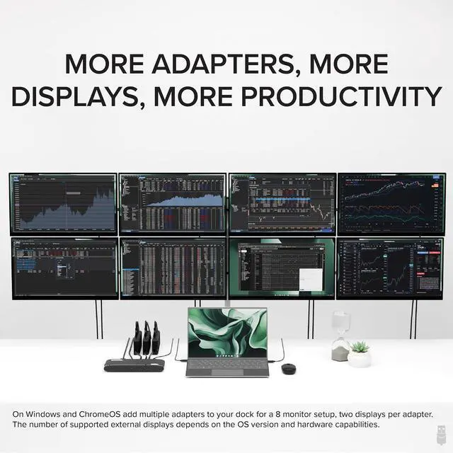 Multiple Monitors: This Dual Monitor Adapter not only allows two additional displays but also allows you to customize your setup further with the options for a quad or triple display by combining the adapter with a single USB-C dock. Windows and ChromeOS users can use this adapter with an existing docking station to support up to eight 1920x1080 (HD) displays when using multiple adapters (two 1080p displays per adapter).