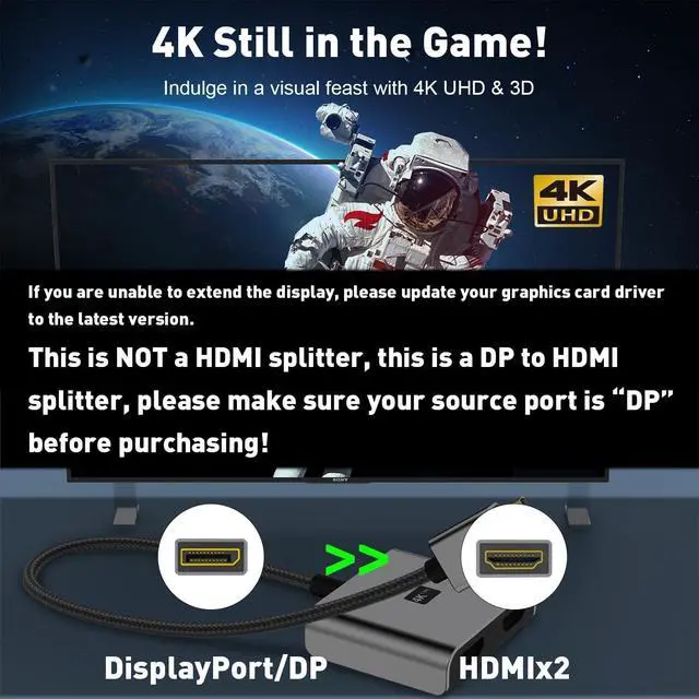 *Note: Cannot be used with any Hub/Docking/KVM - Please check the device port before purchase4K UHD Visual FeastDual monitor expansion using DisplayPort to Dual HDMI Adapter. Transfer 4K (3840x2160) @60Hz content directly to monitor/TV/projector. Supports HDCP 2.2 and complies with DP 1.2 and HDMI 2.0 standards. Single HDMI resolution up to 4K@60Hz dual HDMI screen resolution up to 4K@30Hz. (Make sure your input and output devices both support the same resolution) - If you can't get Extended Mode update your graphics card driver to the latest versionPlug and Play SolutionThe DP to Dual HDMI Adapter is plug-and-play no drivers to install no time to waste and easily extends dual displays.