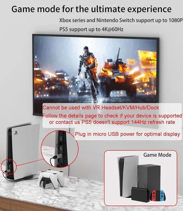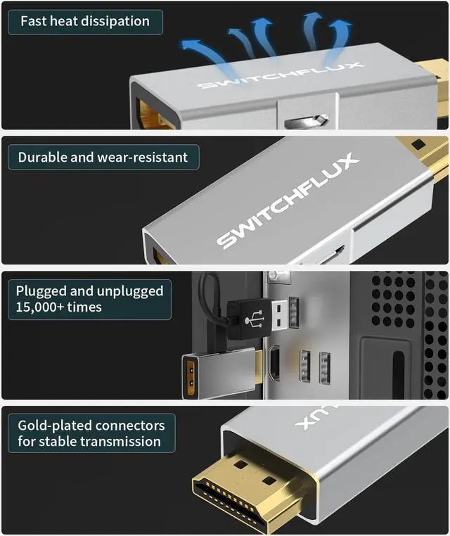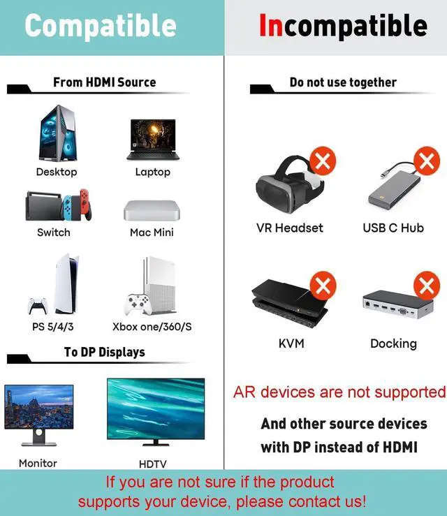 (Note: Cannot be used with VR Headset/KVM/Hub/Dock)Wide CompatibilityThe hdmi to display adapter is perfectly suited to all HDMI input devices and DP Monitors devices. Compatible with PC desktop computer XBox 360 XBox One PS4/ PS5 MacBook Pro 2015 Mac Mini etc. Support DisplayPort 1.4 b/ 1.2 a HDCP 2.2 / 1.3 / 1.4 HDMI 2.0 and HBR2 (High-Bit-Rate 2) which can delivers crystal high definition images. For Xbox series and Nintendo Switch support 1080P only PS5 support up to 4K@60Hz. Premium Product Quality&SupportSWITCHFLUX is dedicated to providing high-quality hdmi to displayport cable adapter to our customers. We offer lifetime after-sales service to each customer. Our customer service team responds within 12 hours in case of any cable failures during use and provide you with a perfect solution.
