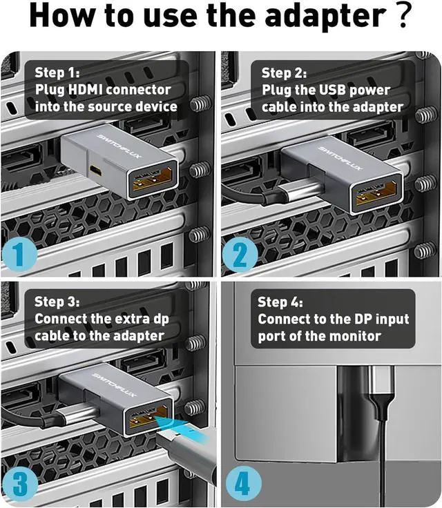 4K UHD Visual EnjoymentThis 4K@60Hz HDMI to DisplayPort adapter supports mirroring and extended modes to transfer high-definition signals from the HDMI output ports of laptops and computers to DisplayPort monitors and HDTV and projectors for video games or streaming. Backward compatible with 4K@30Hz 1080P@120Hz 1080P@60Hz 1080i 720P resolution (Note: only transferred signal from HDMI to DisplayPort unidirectional. not support 1440P@144Hz and HDR)Premium HDMI Adapter24K gold-plated connector of HDMI to DisplayPort Converter is able to resist corrosion to ensure there is stable video transmission without signal interference. The aluminum alloy housing design can dissipates heat effectively. Such a small and lightweight HDMI adapter allows you to experience the stunning 4K visual enjoyment. (Please connect the micro USB power cord to plug in and use it to achieve better display effect. )Plug and PlayOur HDMI Male to DP Female adapters will come with a USB power cable which is ready to use and ensure stable signal transmission as soon as you plug the power cable into the adapter and the source device without having to install drivers or software. It offers a clear and lag-free viewing experience superior to WIFI screen casting.