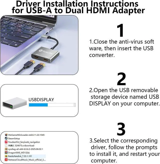 (Note: Please close the antivirus software before installation. For subsequent repeated use on the same computer there is no need to install it again)1080P 60Hz Full HDUSB 3.0 to HDMI adapter cable gives 1920*1080 display. Use with computer's HDMI & USB to connect two. If screen res >1920*1080 adjust to 1920*1080. With USB 2.0 or unsupported receiving device output is 800*600. Else it failsExceptional Quality This USB to Dual HDMI adapter for monitor of high-quality materials is sturdy durable. Passed strict checks ensuring stable per. And reliable Conn. Good for long-term use and frequent ops. Exquisite design beautiful and practicalWide CompatibilityThis HDMI Splitter for Dual Monitors is compatible with multiple operating systems such as Windows and macOS. Moreover it supports mirror and extended modes which can enhance work efficiency. Whether for work or entertainment these two modes can bring you more convenience and possibilities. (A simple driver installation is required as is the case with similar products. ) If you have any questions please contact us promptly. We offer 7*24-hour after-sales service