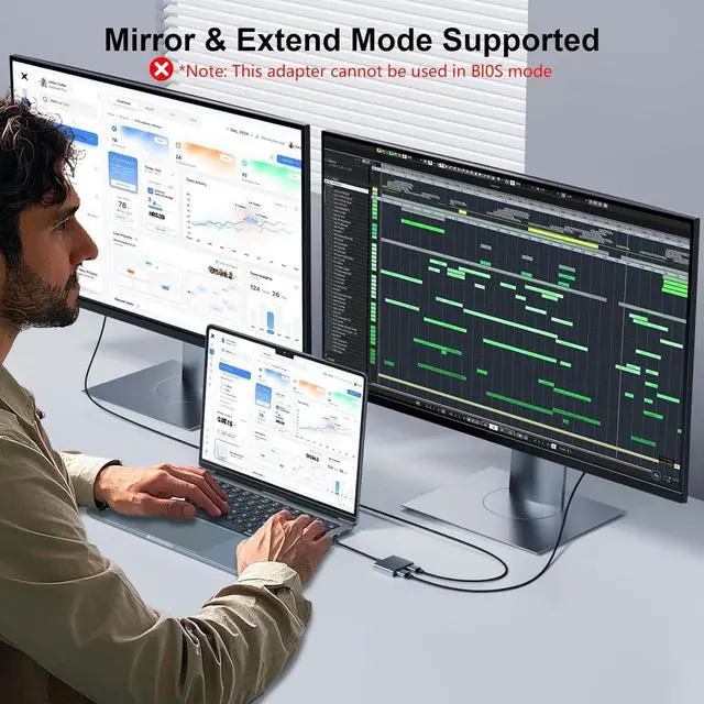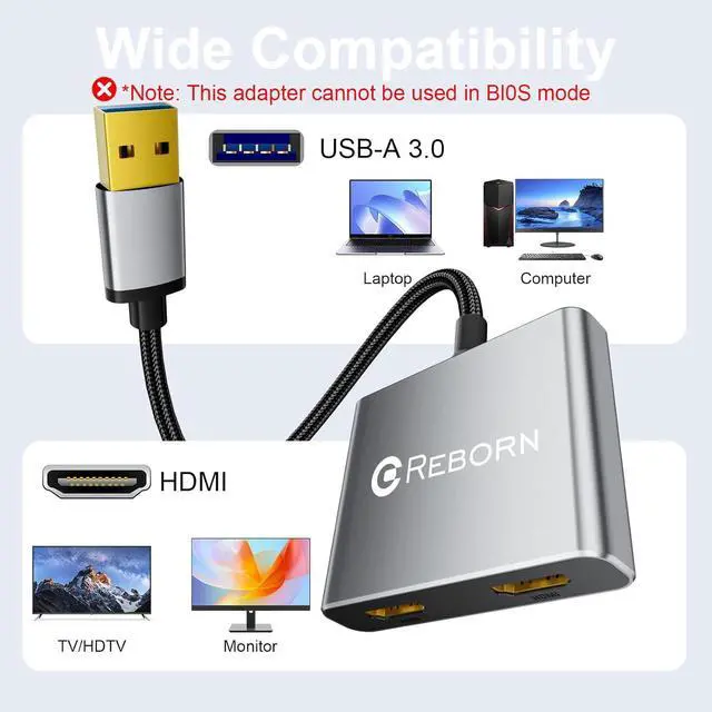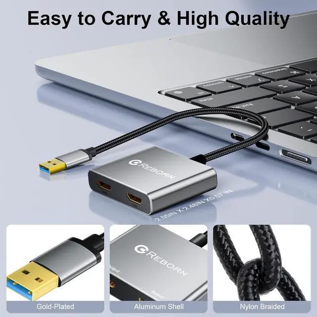 USB to Dual HDMI AdapterBoost productivity with the Reborn Dual Monitor Adapter! This compact dual HDMI adapter for 2 monitors connects two HDMI displays via USB enabling SST/MST mirroring/extension on Windows/Mac. Driver-free and plug-and-play it delivers crisp 1920*1080 resolution per screen for multitasking presentations or entertainment. Upgrade your dual-screen setup today!