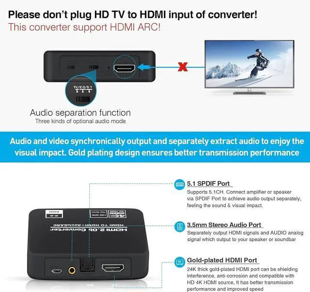 Audio Splitter Extractor: avedio links HDMI to HDMI audio extractor converter can extract audio from a digital HDMI signal to your Amplifier Soundbar Speaker etc. It allows output separately to an audio receiver without powering on your HDTV/ Monitor and Optical Toslinks SPDIF and 3.5 mm audio support ARC function.?? 4K 60Hz