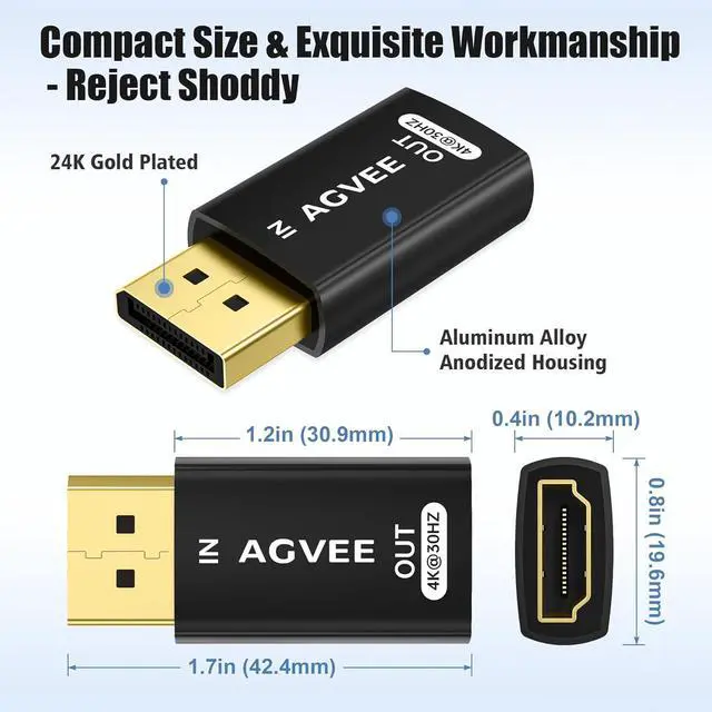 Note: this DP-to-HDMI adapter is not suitable for accessories with built-in chips such as USB-C Hub HDMI-to-VGA adapter or cable and HDMI-to-DVI cable. The DP-to-HDMI adapter only supports the conversion from DisplayPort source signal to HDMI target signal not reversible.? [Latchless Design & Ultra Short] The DisplayPort standard specifies that latches are optional. The latch is designed for reliability but according to many users it really brings nothing more than problems! The latch button is hard to press and is inconvenient even when you can do it. DP's latch is as useless as cecum experienced users will certainly agree with this.? [Compatibility] This adapter from DP to HDMI 2.0 is completely suitable for all kinds of laptops desktops GPUs graphics cards and other devices with DisplayPort socket. It connects DP signal device and